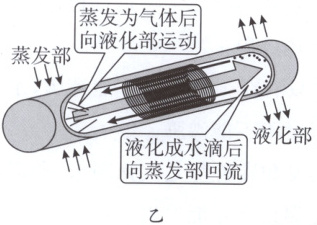 热管:热管是 $20$ 世纪 $80$ 年代研制出来的一种导热本领非常强大的装置,如图乙所示。热管是一根两端封闭的金属管,管的内壁衬了一层多孔的材料,叫作吸收芯,吸收芯中充有酒精或其他易汽化的液体,当管的一端受热时,热端吸收芯中的液体受热汽化变成气体,气体沿内管运动到另一端(冷端)。而冷端由于未受热,温度低,气体就会因放热而液化,被冷凝的液体又被吸收芯吸附,通过毛细作用又回到热端。如此循环,热管的热量就不断地从一端输送到另一端。