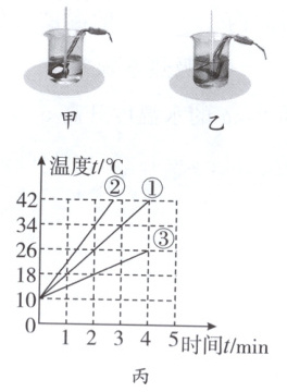 (3)图丙中①是乙加热时温度随时间变化的图线,如果将初温相同的乙物质质量增加到原来的2倍,不考虑热损失,用相同的加热器加热,单位时间内吸收的热量相同,根据Qₐ=c*mΔt可知,质量增大后相同时间内温度变化量减小,温度随时间变化的图线为图中的第③条。
