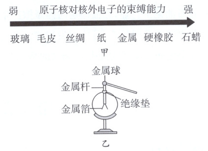 5. 图甲为部分物质的原子核对核外电子束缚能力强弱情况,束缚能力越弱越容易失去电子。现用丝绸摩擦石蜡,然后将该石蜡靠近轻质小球,发现它们相互排斥,再将石蜡触碰了验电器的金属球,发现金属箔片张开,如图乙。下列说法正确的是(