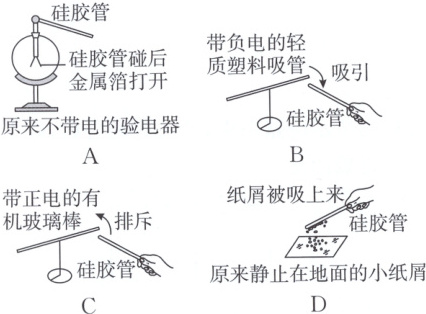 4. 毛皮与硅胶管均不带电,小叶戴着绝缘手套用毛皮摩擦硅胶管后,小叶对硅胶管的带电情况十分好奇。下列操作以及现象中,既证明硅胶管带电,也证明摩擦过程中硅胶管带电性质的是(