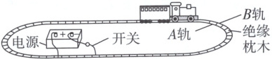 4. (情境化)如图所示,A、B 是两条闭合金属轨道(外轨 B 略大),A、B 间用很多绝缘小枕木连接并固定在绝缘水平面上,由电池通过轨道给电动玩具火车供电。在一次使用中发现,正在运行的火车在轨道上停止了。经检查,电源及从电源到轨道的连接都没有问题,那么故障最有可能是(
