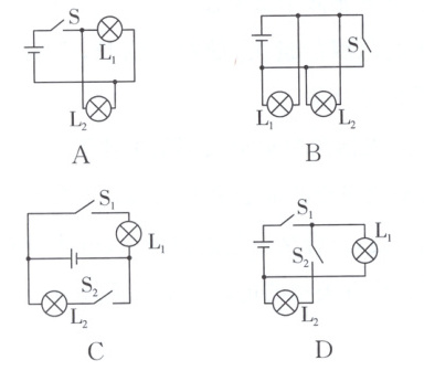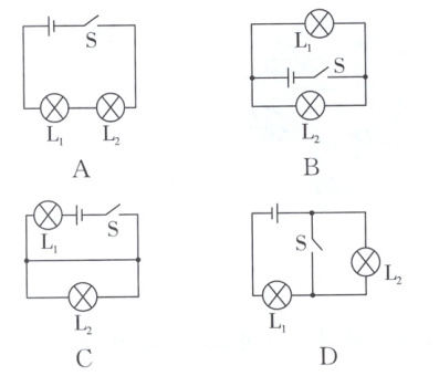 5. 如图,开关 S 闭合时,灯泡 L₁与 L₂组成串联电路的是(