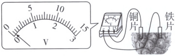 5. 将铜片和铁片插入菠萝中,制成一个水果电池。用电压表测量这个自制电池的电压,其现象如图所示。下列说法正确的是(