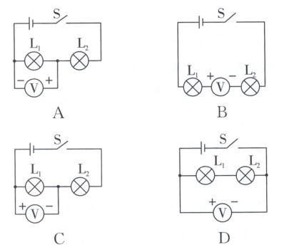 3. 如图所示,用电压表测灯泡 $ L_{1} $ 两端的电压,下列接法正确的是(