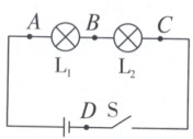 3. 如图所示,小明在“探究串联电路电流规律”实验中,闭合开关后,两只灯泡均不亮,他用一个电流表去检测电路故障。当电流表接 $ A、B $ 两点时两只灯泡均不亮;当电流表接 $ B、C $ 两点时,有一只灯泡亮了,且电流表有示数;当电流表接 $ C、D $ 两点时,两只灯泡也均不亮。产生这一现象的原因可能是(