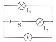 4.C 解析:分析电路图可知,电流的路径只有一条,则两灯串联,且电压表$V_1$测电源电压,电压表$V_2$测灯泡$L_2$两端的电压;根据串联电路的电压规律可知电源电压大于$L_2$两端的电压,所以两电压表示数不同,且电压表$V_1$的示数大于$V_2$的示数。