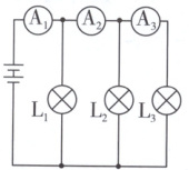 3.D 解析:由图可知三灯泡并联,$A_3$测通过$L_3$的电流,$A_2$测通过$L_2$、$L_3$的电流,故一定有$I_2>I_3$;$A_1$测通过三个灯泡的电流,故一定有$I_1>I_2$;所以,$I_1>I_2>I_3$。