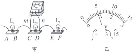 3.D 解析:由图乙可知,电压表选用的是小量程,分度值为$0.1 V$,示数为$1 V$;灯泡的规格相同,三个灯泡串联在电路中,所以每个灯泡两端的电压相同,根据串联电路的电压规律可知,电源电压即$AF$两接线柱间电压为$1 V+1 V+1 V=3 V$,故A错误;由图可知,C接的是电压表的负接线柱,这说明电流是从右流向左的,所以A端导线应与电源的负极相连,将导线$n$从D点拆下,再接上A点,会使电压表正、负接线柱接反,故B错误;$CD$间的电压表换上正常的电流表,通电后电流表相当于导线,$CD$间被短路,电流表与另外两个灯泡串联,电流表示数不为零,故C错误;若将小灯泡$L_2$从灯座上旋下来,开关未断,电压表被串联在电路中,电压表示数应该等于电源电压,大约为$3 V$,故D正确。