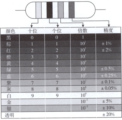 以四环电阻为例,四个色环的第一、第二环分别代表阻值的前两位数;第三环代表倍率;第四环代表误差。详见各色环的颜色对照表(如图所示)。
