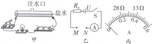 有关。(2)小华将适量盐水从注水口倒入塑料管中并闭合开关,观察到小灯泡发光,由此说明盐水是