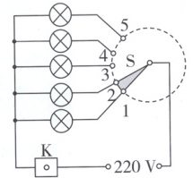 2. 小敏家住某 5 层公寓楼中的 4 楼,当他在 1 楼按下楼道灯开关,5 盏“220 V 12 W”的楼道灯全部点亮,然后延时 60 s 均自动关闭。他正常每登一层楼所需时间为 12 s。小敏意识到楼道灯这样的工作方式有些浪费电能,所以对楼道电路进行设计,改进电路如图,K 为启动延时开关,S 为感应跳转开关,K 按下时 S 接通触点 1、2,S 感应到人到 2 楼,跳转至触点 2、3,感应到人到 3 楼,跳转至触点 3、4……跳转后若 20 秒后感应不到人,则 K 断开。