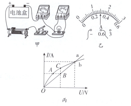 。 $(5)$闭合开关,移动滑片,记录电流表和电压表示数,进行多次实验,绘制出$ I - U $图像,如图丙中$ b $所示。实验完成后,将小灯泡换成定值电阻,重复上述实验过程,绘制出$ I - U $图像,如图丙中$ a $所示。根据图像$ a $可得出结论: