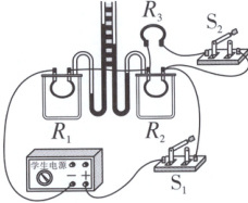 的关系。倘若在额定电压下,通过的电流为 2 A,$ R_{1} $ 的电阻是 3 Ω,$ R_{2} $ 的电阻是 2 Ω,则每分钟 $ R_{1} $ 和 $ R_{2} $ 产生的热量差为240 J