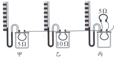 (1)甲密闭容器内电阻丝阻值为 5 Ω,丙密闭容器外部有一个阻值为 5 Ω 的电阻丝与丙容器内的电阻丝并联,目的是使通过甲、丙两密闭容器内电阻丝的
