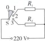 2. 小玥在妈妈指导下用电熨斗熨烫衣服,她首先阅读说明书,知道电熨斗有“低温”“高温”两个挡位,其简化电路如图所示,$ R_{1} $、$ R_{2} $ 是电热丝,$ R_{1} = 48.4 \Omega $,$ R_{2} = 96.8 \Omega $,S 为旋转式开关。当电熨斗为加热挡位时,该挡位通电 1 min,电流产生的热量为