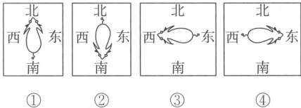 1. 某科技网站报道:“牛能感知地球磁场,吃草、休息时,其身体朝向习惯与地磁场磁感线平行(如图所示)。”为求证真伪,同学们设计如下实验方案:在四周无明显差异的草地上,多次观察牛吃草、休息时的身体朝向,若报道真实,则牛的身体朝向习惯性呈现四个场景中的(