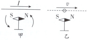 3. (综合应用)如图甲所示,在观察奥斯特实验时,小明注意到放置于通电直导线下方小磁针的 $ N $ 极向纸内偏转。小明由此推测:若电子沿着水平方向平行地飞过小磁针上方时,小磁针也将发生偏转。小明推测的依据:。图乙中磁针的 $ N $ 极会向(选填“纸内”或“纸外”)偏转。
