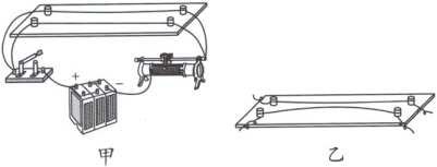 (1)小刚和小强商议通过实验来研究这一问题。他们找到了两根柔软的导线,相距较近地并排固定在接线板上,实验电路如图甲所示。通过实验观察到的现象如图乙所示。该实验表明:两个通电导体之间