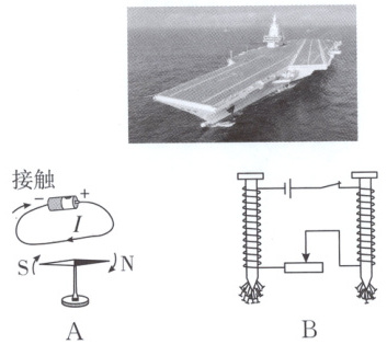 1. 如图所示的“福建舰”是中国完全自主设计建造的首艘弹射型航空母舰,采用平直通长飞行甲板,配置电磁弹射和阻拦装置,满载排水量8万余吨。当电磁弹射车内的导体通过强电流时,即可产生强大的推力,将航母舰载飞机弹出。下列选项图中能正确反映电磁弹射器工作原理的是(