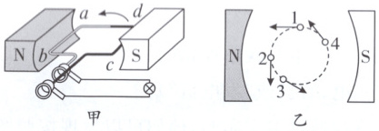 2. 如图甲所示是发电机原理的示意图,图乙中的“○”表示导线ab,当它在磁场中分别转动到1~4位置时(运动方向已用箭头标出),下列说法正确的是(