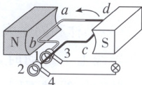3. 如图所示是交流发电机的工作原理图,线圈abcd处于向右的磁场中,两个铜环1、2分别与线圈两端相连,可随线圈一起转动;3和4是电刷,它们分别跟铜环1、2接触,使线圈和灯泡组成闭合电路,在图示位置,ab边切割磁感线产生感应电流的方向为从a到b,则(