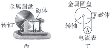 。(2)图丙是法拉第发明的能够产生持续电流的机器——发电机,金属圆盘可以看成由无数根长度等于圆盘半径的导线组成。金属圆盘在磁极间不断转动,每根导线都在做切割磁感线运动,从而产生持续的电流。某校探究小组仿制了这个发电机装置,如图丁所示,对影响电流大小的因素进行了如下探究: