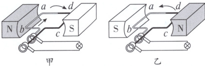 6. 如图所示是研究交流发电机的原理图,当线圈在磁场中顺时针转动时,ab中电流的方向如图甲所示;当线圈在另外一个磁场中逆时针转动时,在图乙中用箭头标出ab中电流的方向。