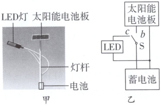 4. (情境化)图甲是道路两边的太阳能路灯,它主要由太阳能电池板、控制器、蓄电池组和12个LED灯组成。它的结构如图乙所示,每个LED灯的工作电压约为2V,蓄电池组的电压为24V。下列说法正确的是(
