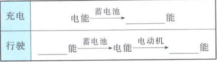 6. 如图所示是国产某品牌纯电动汽车,其充电和行驶时的能量转化情况如下表,请填写完整。