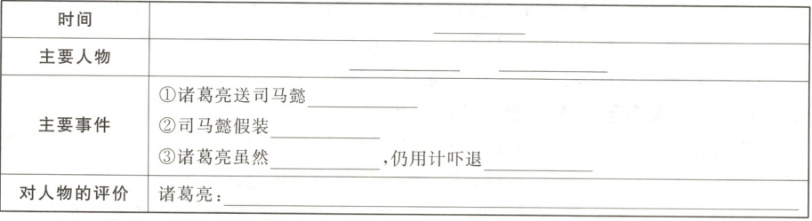 1.公元234年 诸葛亮 司马懿 ①妇女的服饰 ②上奏章 ③病死五丈原 司马懿 镇定自若,神机妙算 2.D 3.D 4.这是借对手之口称赞诸葛亮智慧过人,比直接夸赞诸葛亮智慧过人更有说服力。 5.亲自率领十万大军攻打魏国,想尽办法争取与魏军决战;军营里大小事情都亲自抓;每天早起晚睡,操劳过度,积劳成疾,病死在五丈原;临死前,不但对国家大事做了具体安排,还对自己死后如何撤军做了具体部署。(至少写出三点)