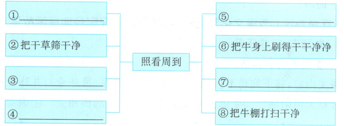 1.B 2.A 3.①给牛吃很好的草 ③牵到小溪上游喝干净的水 ④夏天在树林里休息 ⑤冬天在山坡上晒太阳 ⑦用蒲扇赶跑牛虻 4.示例:这么多年来,你一直对我照顾有加,就像对自己的亲人一样。我一定要用实际行动来报答你!
