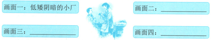 【镜头一】1.环境 小厂面积小 小厂环境差 2.C 【镜头二】1.动作 脊背弯曲着 头凑到缝纫机板上 2.B 【镜头三】1.D 2.示例:寒冬的清晨,妈妈骑车送我上学。寒风刺骨,她的脸冻得通红。她让我紧紧贴着她的后背,用瘦弱的身躯为我挡住了阵阵寒风。我贴着她颤抖的背,鼻子一酸,眼泪悄悄地落了下来。【镜头四】1.形声字 jūn 皮肤因寒冷干燥而开裂 2.动作 挣钱的艰辛以及对钱的珍惜 排比 为了挣钱不辞辛劳、争分夺秒地投入工作状态,一刻也不敢停歇 3.C 4.谁叫我们是当妈的呀!我挺高兴他爱看书的! 示例:母亲挣钱这么艰难却还是毫不犹豫地支持我买书,母亲是多么爱我啊,可我又是多么不懂事啊!