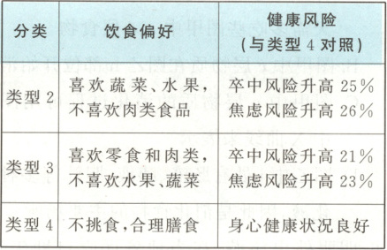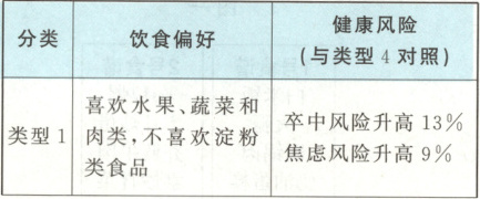 2. (2024·泰安)饮食直接影响着人体健康。研究人员抽样调查人们的饮食偏好,确定了4种饮食类型,并进行了一系列身心指标评估,分析饮食偏好与健康之间的关系,结果如表。下列叙述错误的是(