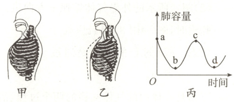 2. 图甲、乙表示人体呼吸时的不同状态,图丙是肺容量随时间的变化曲线。下列叙述正确的是(