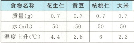 4. 食物所含能量的多少可以用热价表示,食物的热价是指1g食物氧化分解或在体外燃烧时所释放的热量。小楠同学对几种不同食物的热价进行测定,实验结果如表。下列食物热价最高的是(
