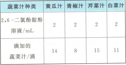 4. 为了检测不同蔬菜中维生素 C 含量的差异,小铭同学根据维生素 C 可使 2,6 - 二氯酚酞溶液褪色的原理,设计了如下实验:在 4 支同样的试管中分别加入 2mL 相同浓度的 2,6 - 二氯酚酞溶液,然后用滴定管分别向其中滴加黄瓜、青椒、芹菜、白菜的组织提取液,边滴加边振荡,直到 2,6 - 二氯酚酞溶液褪色为止,记录下滴入的组织提取液滴数,实验结果如表所示。
