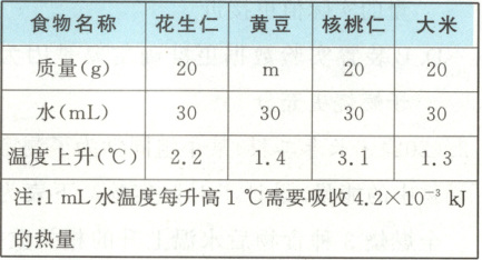 )A.实验中,m的数值应该为20,经计算1g黄豆所含能量约为8.82J