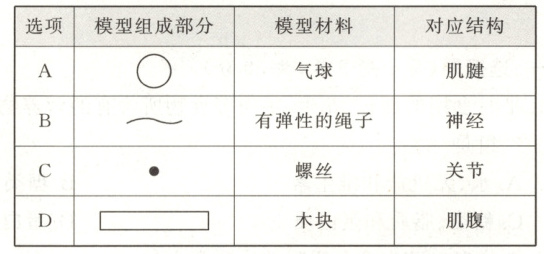 18. 如图是某同学制作的手臂骨、关节和肌肉模型示意图。下表中各部分材料及对应的结构匹配正确的是(