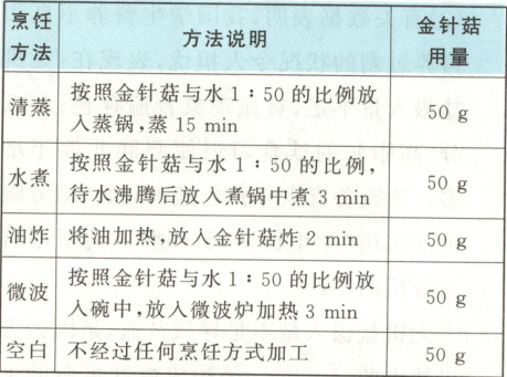 9. 《中国居民膳食指南》提出“会烹”这一膳食准则,对于促进我国居民合理膳食、提高营养健康素养具有重要意义。不同的烹饪方法是否会影响食物的营养成分呢?同学们在老师的帮助下,探究了清蒸、水煮、油炸、微波等烹饪方式对金针菇营养成分的影响,实验设计如下表,请据此回答下列问题。