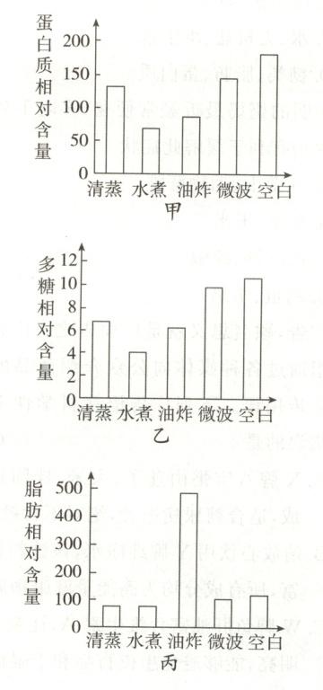 (3)按表中方法烹饪完成后,同学们用滤纸擦去各组金针菇表面的油和水,放入 60℃烘箱内 7h,干燥、磨粉,测定各组金针菇中蛋白质、多糖及脂肪的相对含量,结果如图所示。