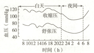 3. 高血压是常见的心血管疾病之一,目前我国成年高血压人数已超过2亿,很多青少年也被高血压困扰。如图为正常成年人24h血压检测结果,则下列叙述错误的是(