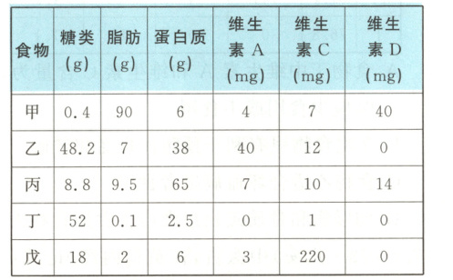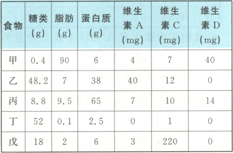 4. (2024·眉山)科学合理的营养有助于身体健康。下表列出了甲、乙、丙、丁、戊 5 种食物(各 100g)中除水和无机盐以外的主要成分含量,据此判断下列分析错误的是(