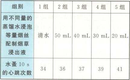 2. 2025年5月31日是第38个“世界无烟日”,主题为“拒绝烟草诱惑,对第一支烟说不”。为宣传这一主题,某实验小组进行了“烟草浸出液对水蚤心率的影响”的探究实验。水蚤的心率因个体不同差别很大,在100~350次/min之间,该小组选择了多个个体大小一致的水蚤,并用同一品牌香烟各半支的烟丝,分别加入50mL、40mL、30mL、20mL蒸馏水浸泡一天,分别取其烟草浸出液,在25℃左右室温中经过大量实验,得到以下平均数。实验结果见下表: