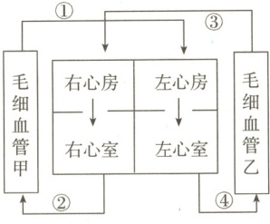 6. 《黄帝内经》谈到“心主身之血脉,脉者,血之府也,经脉流行不止,环周不休。”下图是人体血液循环途径示意图,其中①②③④表示与心脏直接相连的血管,甲、乙表示不同部位的毛细血管网。据图回答问题。