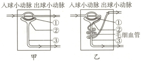 4. 为理解尿液的形成过程,同学们运用模型建构的方法绘制了甲、乙肾单位模型。下列说法正确的是(