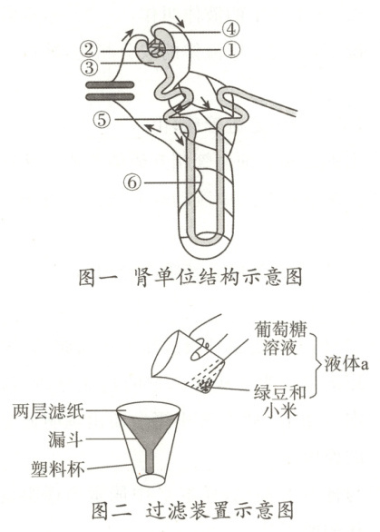 6. 肾单位是肾脏结构和功能的基本单位(如图一),为了模拟肾单位部分结构的工作原理,同学们制作了如下装置(如图二)。请据图分析,下列说法错误的是(