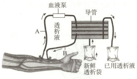 5. 如图为肾衰竭患者进行血液透析的示意图,位于透析液中的导管相当于一层半透膜,小分子物质可以透过,大分子物质不能透过。下列有关叙述正确的是(