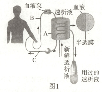 (2)与进入透析器的血液 B 相比,返回人体的血液 C 中尿素含量