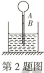 2. B【解析】当外界温度升高时,细管中的气体受热膨胀,体积增大,管中液面将向下运动,所以B点对应的温度较高。