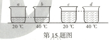 15. D【解析】由图可知,a与b烧杯中水的质量相同,c与d烧杯中水的质量相同,a与c烧杯中水的温度相同,b与d烧杯中水的温度相同。所以d烧杯中水的内能比c烧杯中水的内能大,d烧杯中水的内能比b烧杯中水的内能大,c烧杯中水的内能比a烧杯中水的内能大,b烧杯中水的内能比a烧杯中水的内能大。